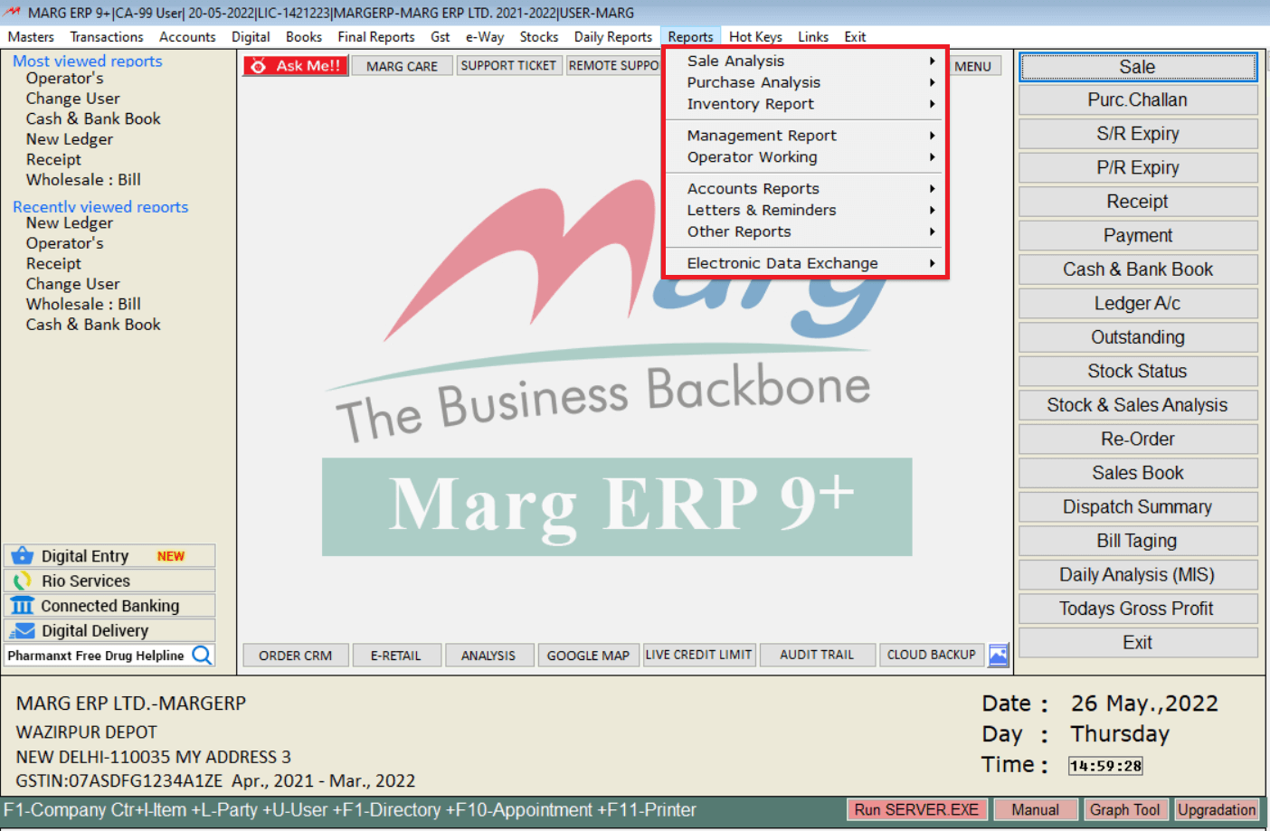 The main window in the Marg ERP Software has the following options: Title Bar, Menu Bar (Masters, Transactions, Accounts, Digital, Books, Final Reports, GST, e-Way, Stocks, Daily Reports, Reports, Hot Keys, Links & Exit).