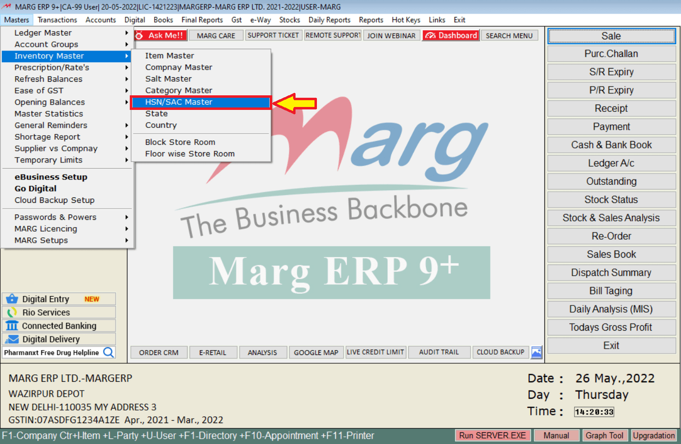 - Go to Masters >> Inventory Master >> HSN/SAC Master.